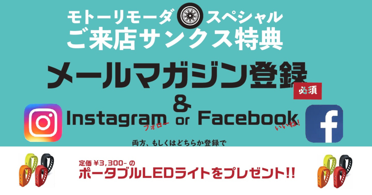 【ご来店キャンペーン】メルマガ・Facebook(Instagram)のフォローでポータブルLEDライトをゲットしよう!
