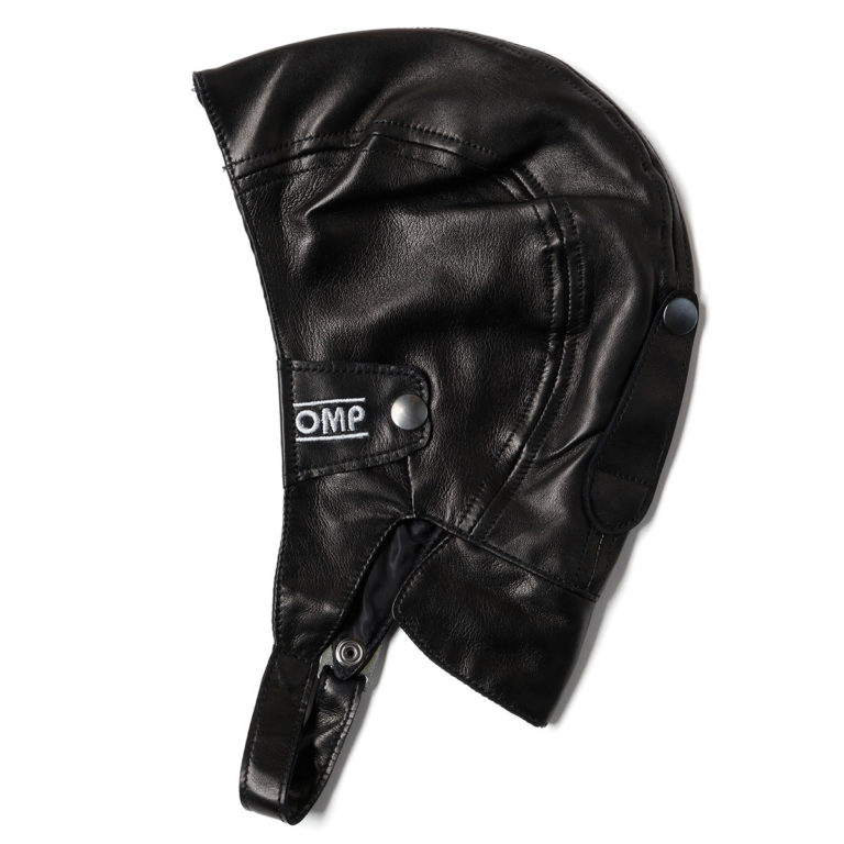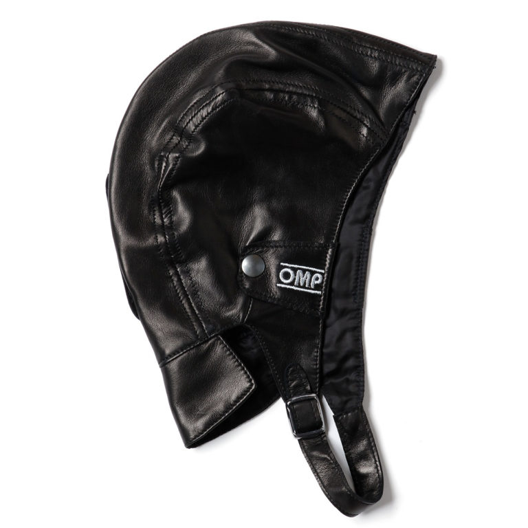 OMP RACING オフィシャルのイタリア製ヴィンテージキャップ。ゴーグルを押さえるスナップ付きのバンドや、あご紐にもバックルが付属。