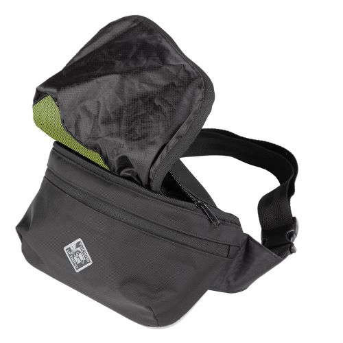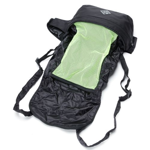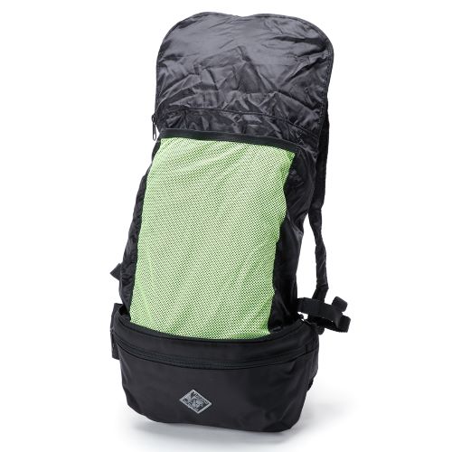 ウェストバック時は容量4Lですが、変形することで最大15.5Lと約4倍の容量が収納可能。外側の蛍光グリーンの部分はメッシュのネットになっているので濡れたレインウェア等外側に入れる事で大事な荷物を濡らすことなく持ち運ぶことも出来ます。