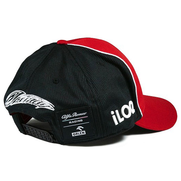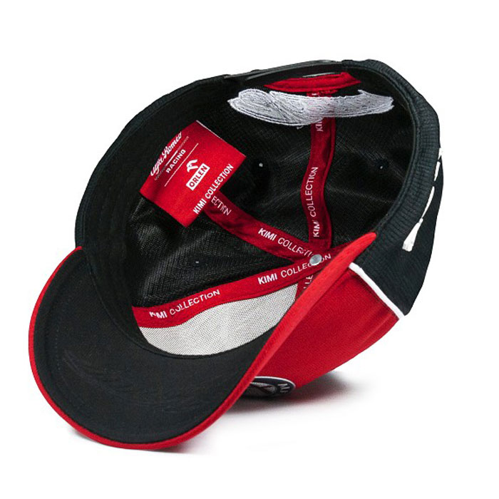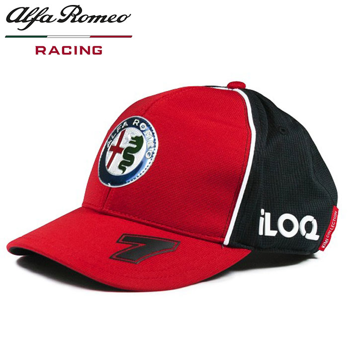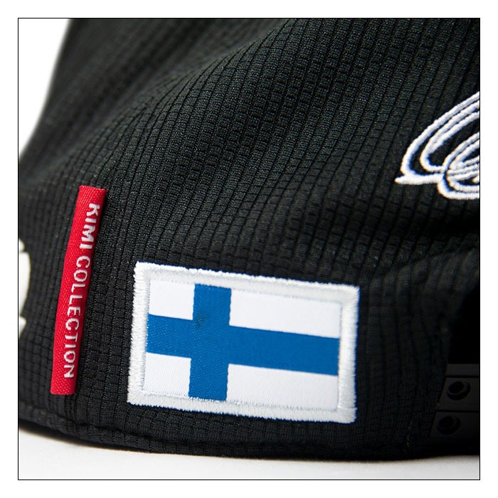 キャップ中央に立体的なアルファロメオのロゴ、ブリム部分にライコネンのゼッケン7の数字、サイド部分にスポンサーロゴ、後頭部部分に刺繍のICEMANロゴと、フィンランド国旗のワッペンがあしらわれています。
