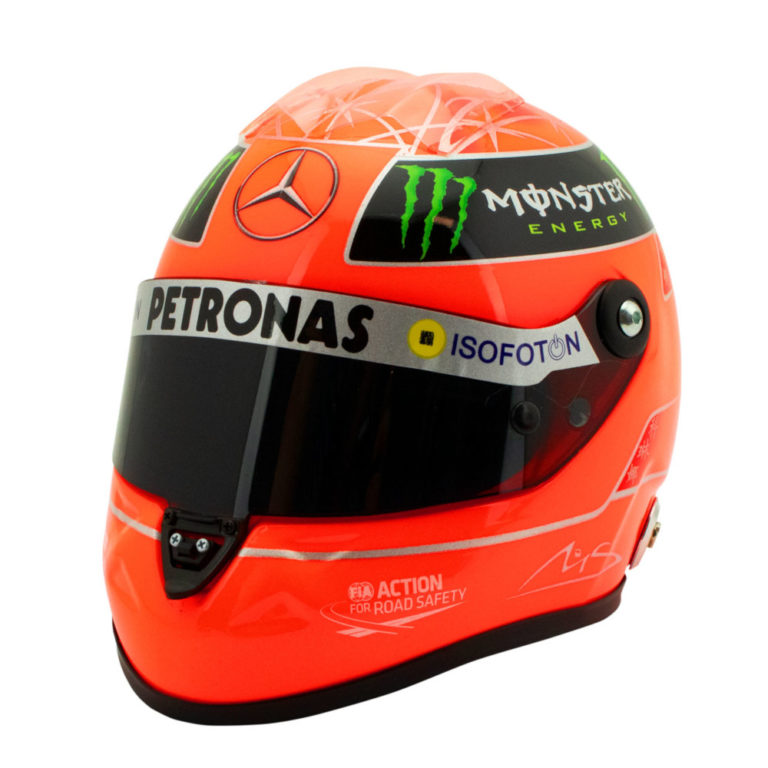 そして「セナは僕のアイドルだった」と発言していたミハエル・シューマッハのヘルメットもまだまだ入手可能で、F1デビューから20周年を記念して作られた2011年ベルギーGP仕様と、最後のシーズンとなった2012年モデルが入荷予定。そして、ミハエルの血を引き継いだ息子ミックが父のチャンピオンカー(ベネトン B194)でデモンストレーションを行った2017年ベルギー・スパ仕様と、自身がF3チャンピオンに輝いた2018年モデルのヘルメットです。ミハエルとミックのモデルはシューベルトが監修しています。