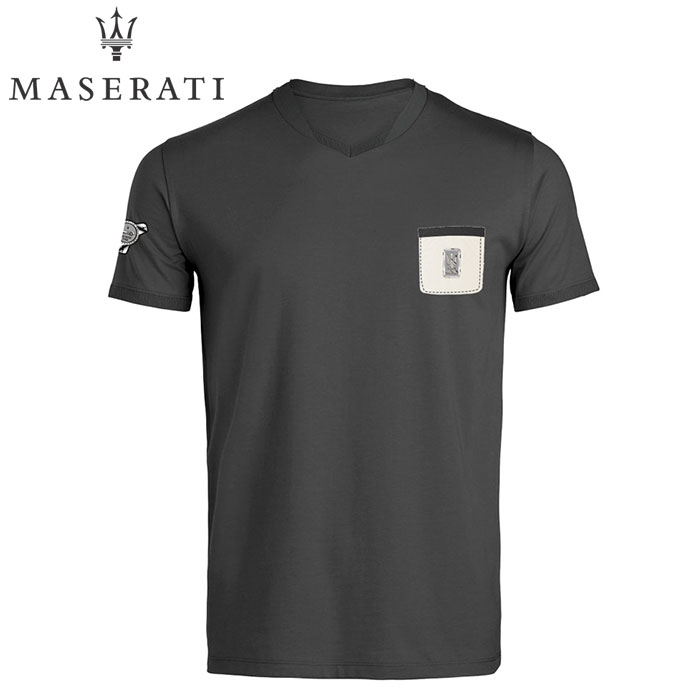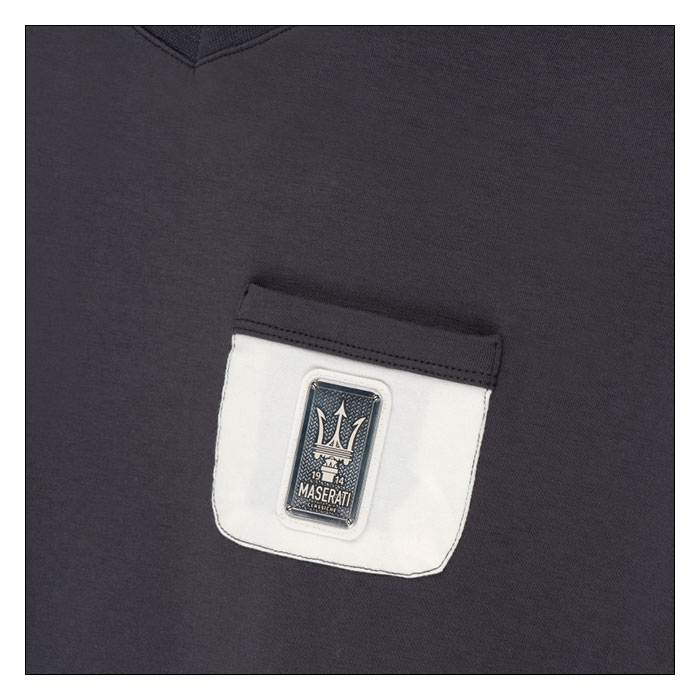 MASERATI CLASSICHE 1914 純正のTシャツ。本体とは別カラーの胸ポケットにトライデントのロゴ、さらに袖部分にエルドラドの420M/58のロゴがあしらわれています。