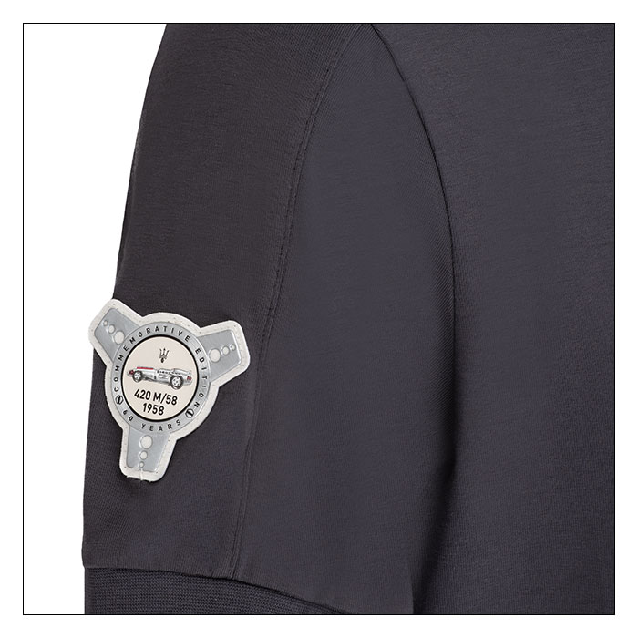 胸元にマセラティのロゴ、両腕にトライデントと1914の数字がそれぞれあしらわれています。袖口と裾口はリブ仕様となっており、クラシケの名の通り、クラシカルでヴィンテージ感漂うデザインに仕上がっています。