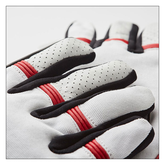 人差し指と中指の指先には操作性を重視しパンチングレザーを使用、グリップに当たる手のひら部分には補強のレイヤーを備えるなど耐久・安全性にこだわりました。