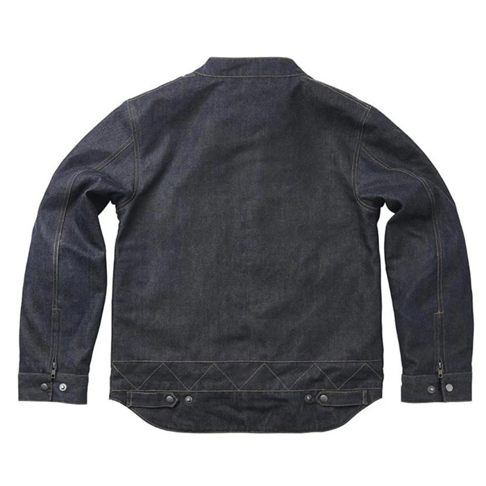 丈夫な14オンスデニムとアラミド繊維素材を使用、内側と外側にポケット(ボタンとジッパー)を装備し、優れた機能性を実現しました。前腕部のファスナーはライディング中のフィット感を向上、首元はスタンドカラーになっています。