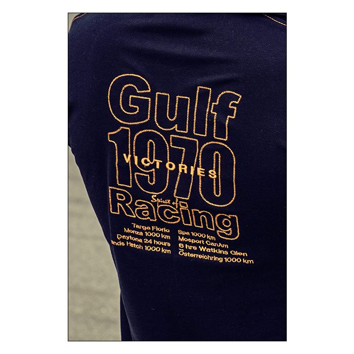 胸元にはガルフのワンポイントロゴ。袖部分には劇中でも活躍したポルシェ917のサークルゼッケン20や、チェッカーフラッグ、アメリカ国旗、ディレイニ―の刺繍がそれぞれあしらわれています。