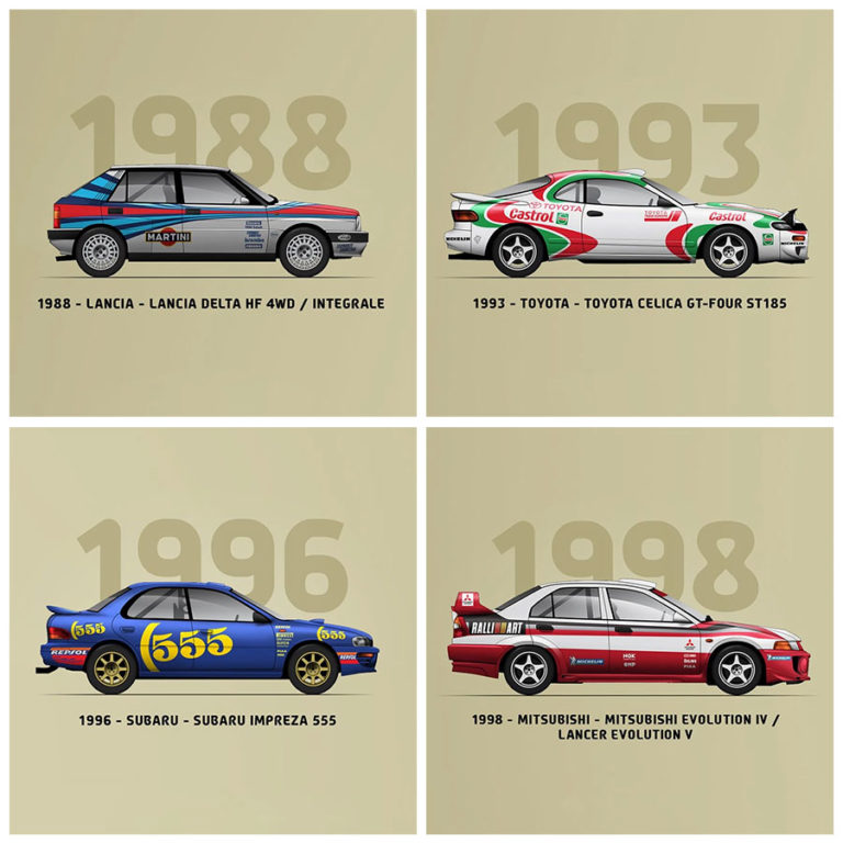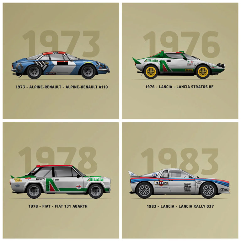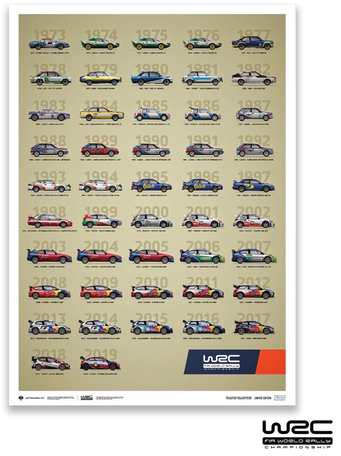 WRC(FIA世界ラリー選手権)として正式にスタートした1973年から2019年までの歴代チャンピオンマシン47台がプリントされたオフィシャルポスター。アルピーヌ、ランチア、フィアット、アウディ、プジョー、トヨタ、スバル、三菱、シトロエン、フォルクスワーゲン、ヒュンダイといった蒼々たるメーカーが凌ぎを削って闘ってきた歴代のチャンピオンカーたちがこの1枚のポスターに集約されています。