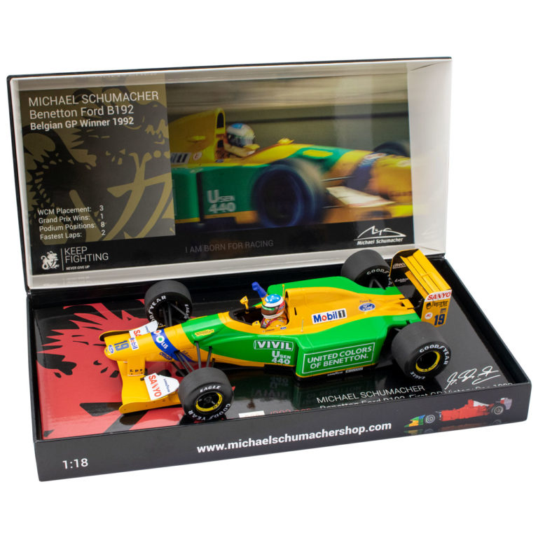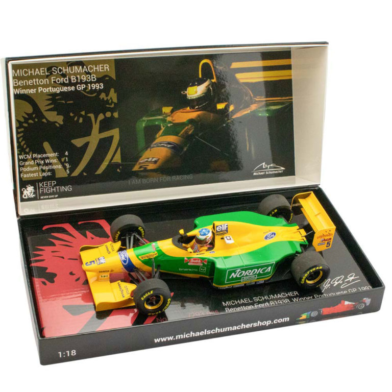 ミハエル・シューマッハが、1993年に勝利を挙げたベネトン・フォード B193B ポルトガルGP仕様と、チャンピオンを獲得した、ベネトン・フォード B194の2台がミハエル・シューマッハのKEEP FIGHTING専用BOXに収められた希少なモデルカーのご予約を受付中!