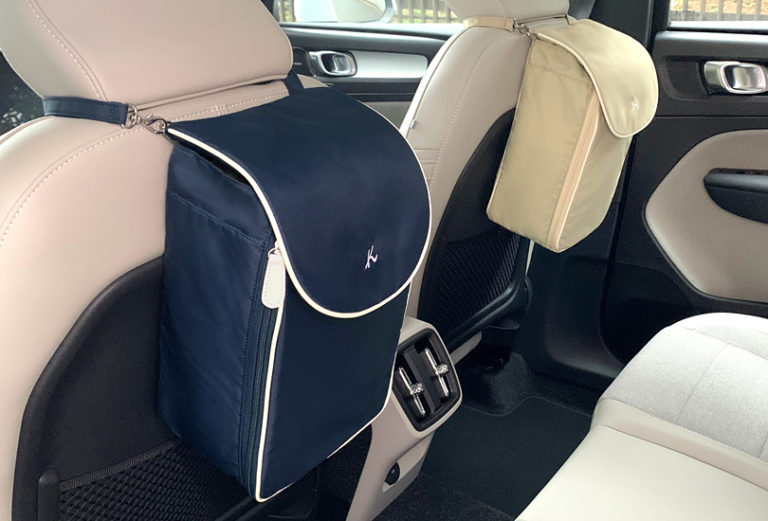 ・持ち歩き用のストラップは、着脱式の金具を使い、車内ではヘッドレストなどに引っ掛けたり、旅行用スーツケースにつなげたりと便利に使えます