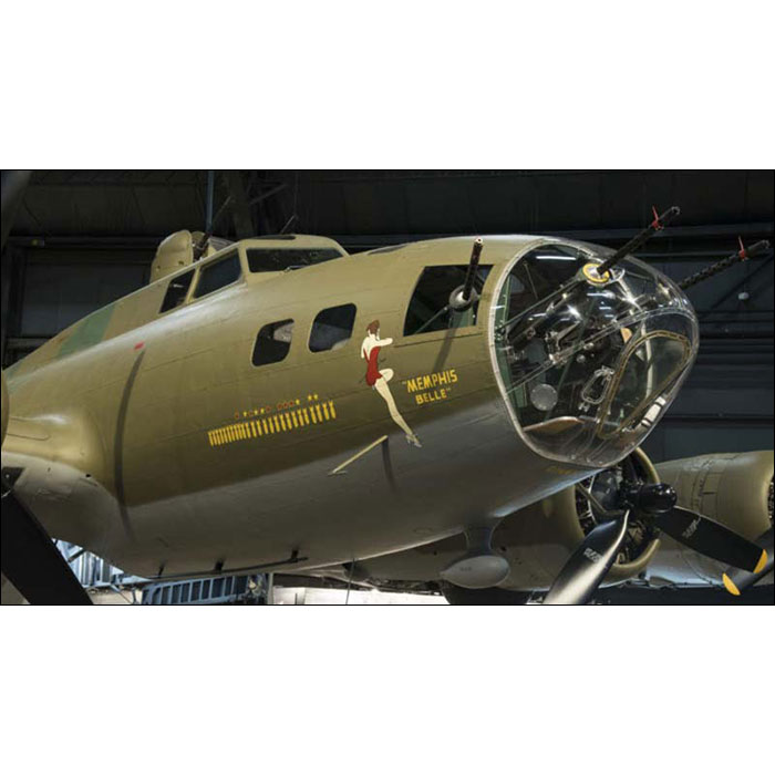 1942年11月7日から1943年5月19日までイギリスを拠点に滞在した「メンフィス・ベル」号はアメリカ第8空軍として活躍した爆撃機。25回がノルマだった出撃達成をドキュメンタリー映画化するために、この「メンフィス・ベル」号は陸軍少佐として従軍していた映画監督のウィリアム・ワイラーを派遣。機体のノーズに描かれたマスコットガールは、当時流行したペティガールズが由来とされています。
