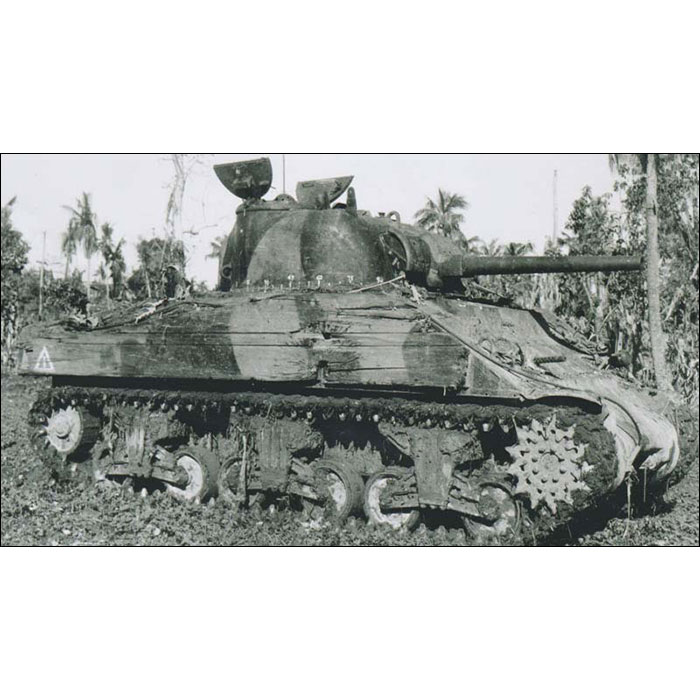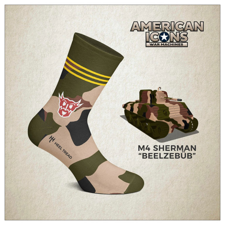 アメリカの代表的な中戦車として活躍し、硫黄島の戦いに参加した海兵隊第4,5戦車大隊のM4M3に描かれたシャーマン戦車"ベルゼブブ"がモチーフ。日本軍の破甲爆雷を始めとする肉薄攻撃から逃れるために、ハッチや車体に様々な補強がされていました。