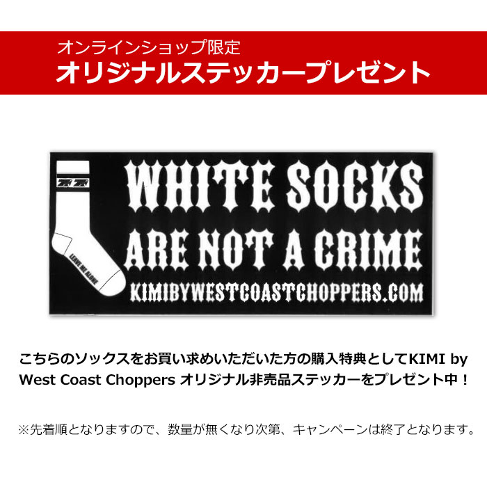 KIMI by West Coast Choppersのオフィシャルアイテムを税抜5,000円以上お買い上げいただいた方先着にて、KIMI by West Coast Choppers非売品ステッカーをプレゼント中!ステッカーは先着順となります。無くなり次第、キャンペーン終了とさせていただきます。予め、ご了承ください。