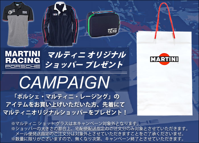 「ポルシェ・マルティニ・レーシング」のアイテムをお買い上げいただいた方先着にて、マルティニオリジナルショッパーをプレゼント中!数量に限りがございますので、無くなり次第、キャンペーン終了とさせていただきます。