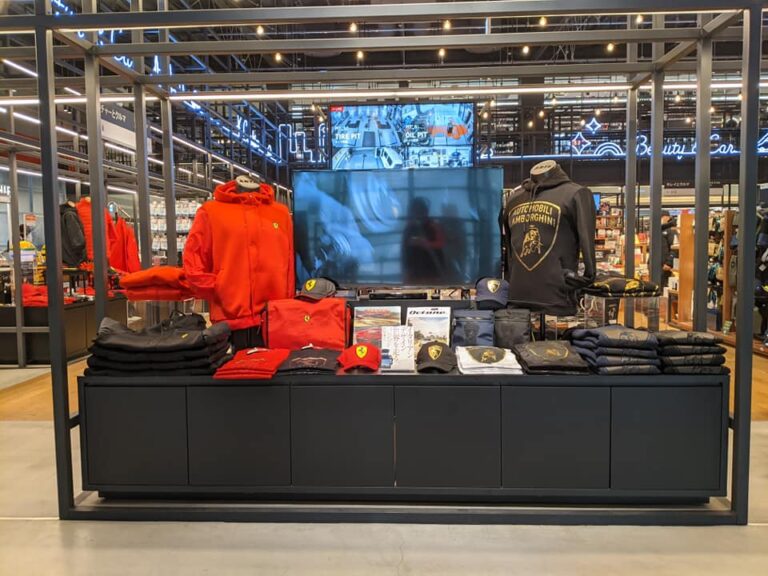 階段を上がり、入り口を入ると、すぐ目の前にフェラーリとランボルギーニの公式ウェアがドンと陳列されていた。