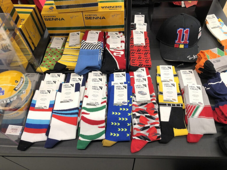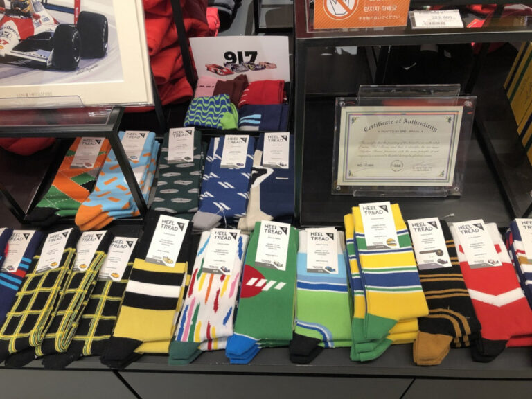 すると反対側には、レーシングブランドの靴下が多数陳列してあった。マルティニカラーやアルファロメオだけでなく、スバリストが泣いて喜びそうな「555」カラーもある。値札を見ると1500円前後。スバラシイ!