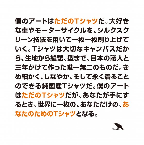 Tシャツ生地は弊ブランドオリジナルのsiro。半袖 or 長袖からお選びいただけます。多種類のインクをご用意し、お客様のオーダーを伺いながら、シルクスクリーン技法を駆使してハンドメイドにて仕上げていきます。
