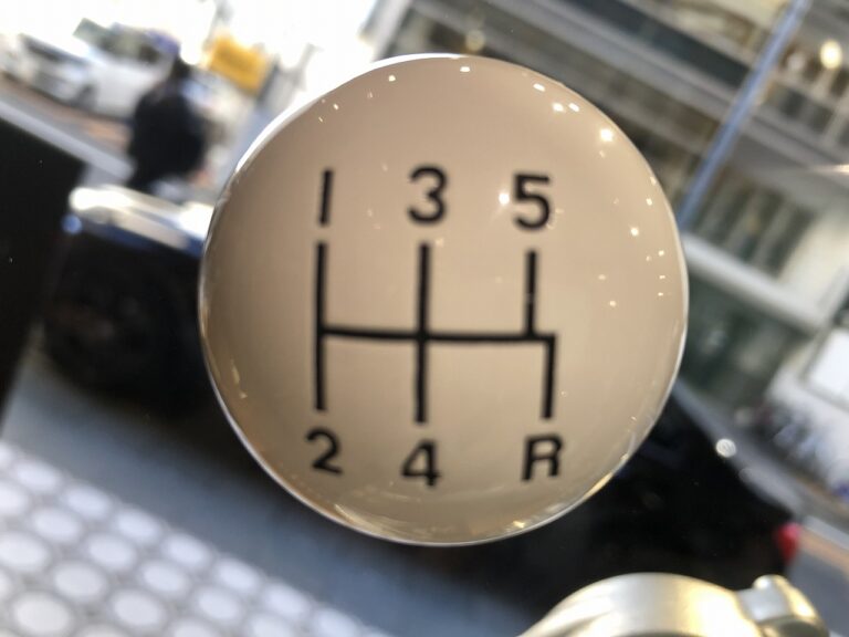 店内に入ろうとして、ガラス扉の把手に感動した。なんと、球形の5速MTシフトノブだったのだ! それも非常にフェラーリっぽい! Rがちょっとズレてるのでフェラーリではないが、何のシフトノブだろう。実にカーマニアの心をくすぐる仕掛けである。このドアノブを握った瞬間に、カーマニアなら「何か買って帰らねば!」という気持ちになる。