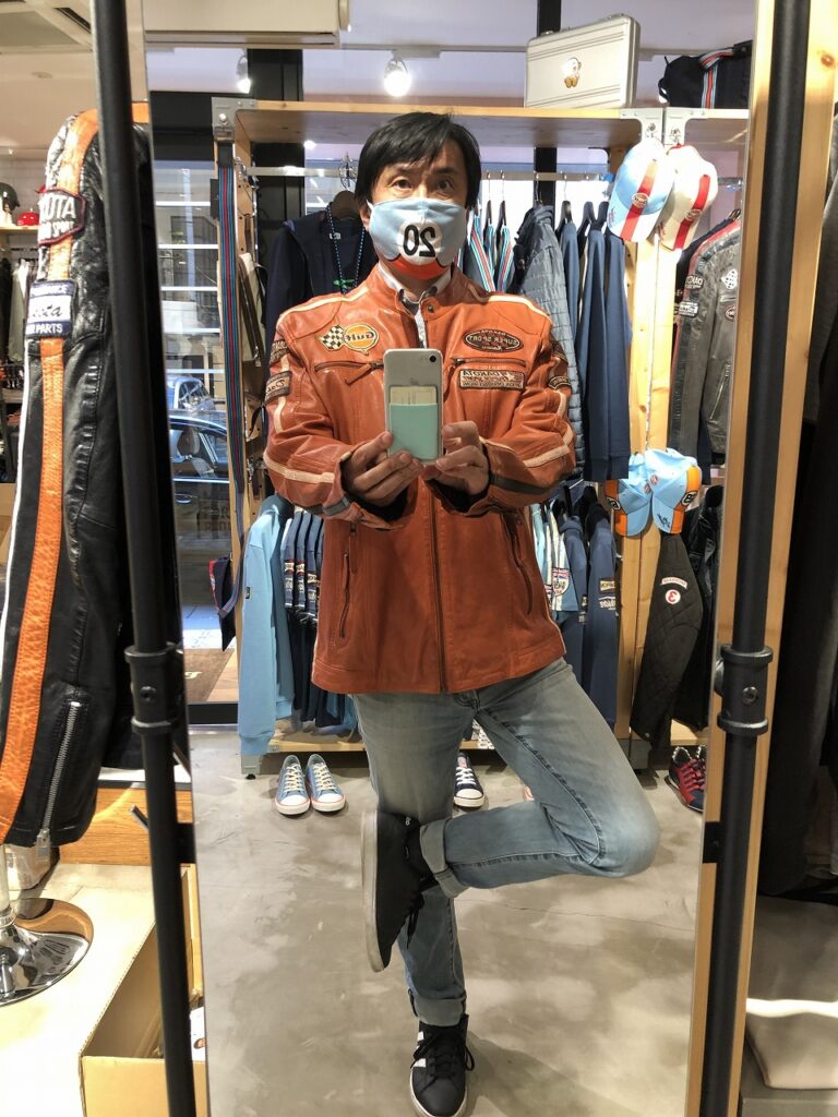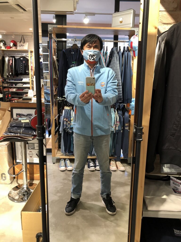 銀座店には、ガルフレーシングの上着が何種類も揃っていた。まずはマスクと同じ水色とオレンジのジャケットを試着した。