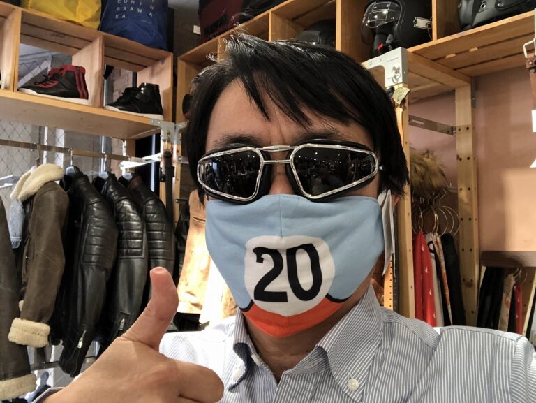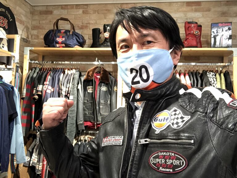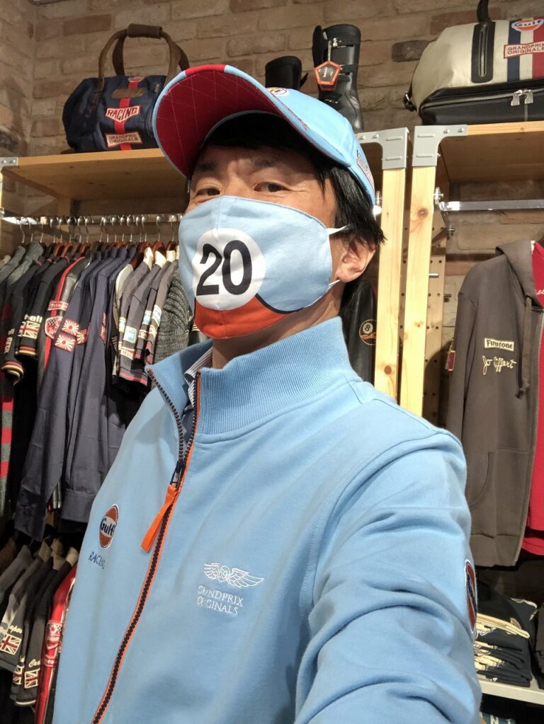 ガルフレーシングのマスクと、ガルフレーシングの濃いグレーの革ジャンのコーディネートは、水色の人ではないけれど、よく見ればガルフレーシングの人。適度なズラシ感が実にイイ。
