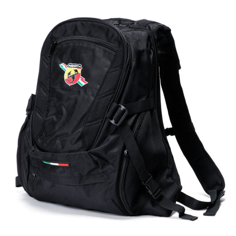 アバルトのサイドエンブレムとトリコロールラインがプリントされたオフィシャルバックパック。
