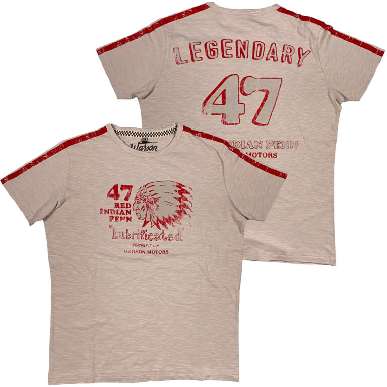 エンジンオイルを発売することになったワーソン・モータースが、赤いアメリカ・インディアンを採用し、当時のオイル缶に描かれたパッケージデザインがそのままTシャツ化されたというパロディ作品に仕上げられています。