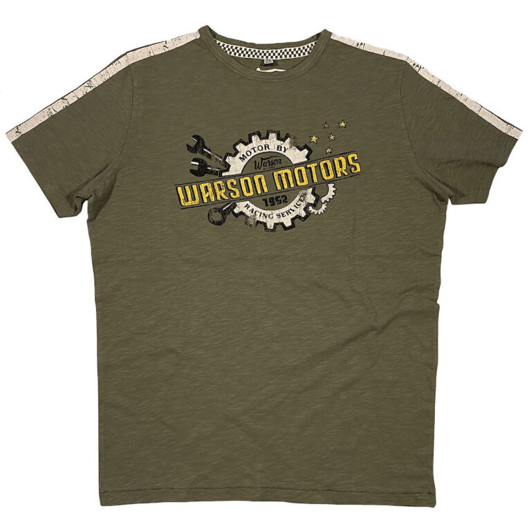 ギアやスパナの絵があしらわれたヴィンテージテイストなTシャツ。1962年に創業したワーソン・モータースがガレージメンテナンスを行うレーシングサービスというテーマに沿って、ヴィンテージなデザインに仕上げられています。