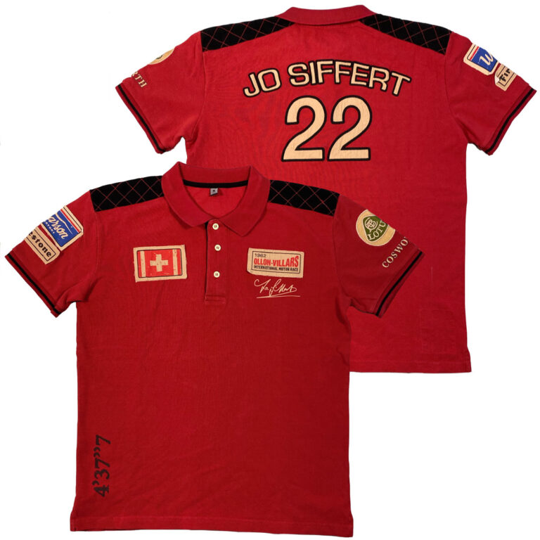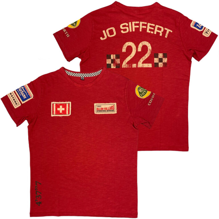 1962年にF1デビューを果たしたジョー・シフェールは、当時スイスのフェラーリディーラーを務めていたスクーデリア・フィリピネッティからジュニアフォーミュラのレースにも参戦。このTシャツは、同年のオロン・ヴィラル ヒルクライムレースにおいて、ロータス22で出場した際に見事クラス優勝を果たした時のマシンカラーやスポンサーが再現されています。
