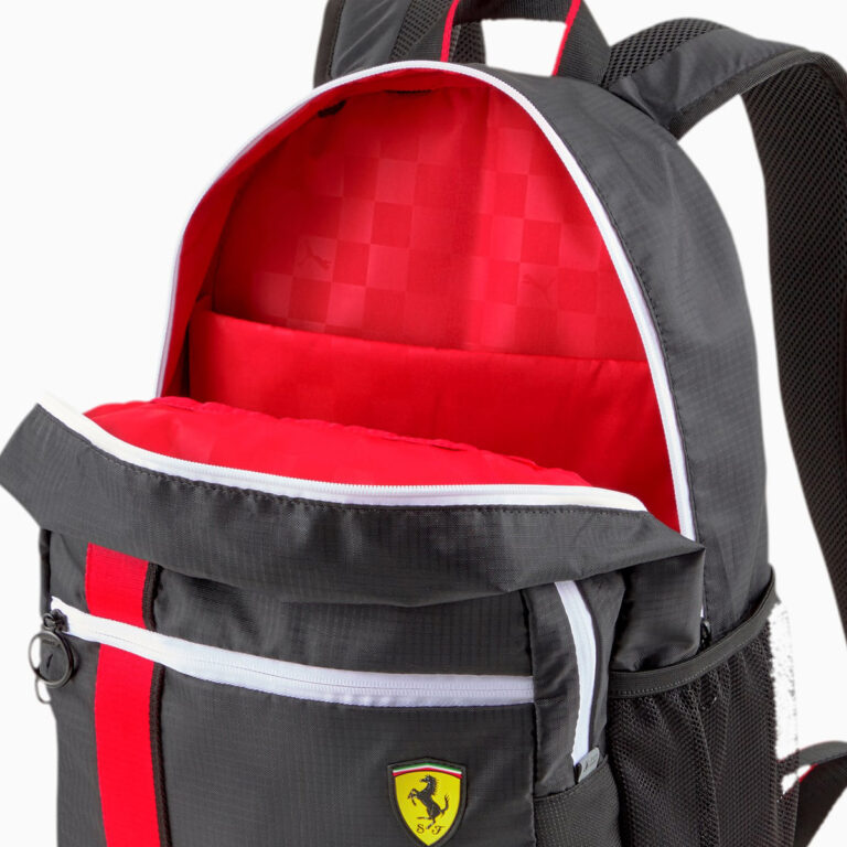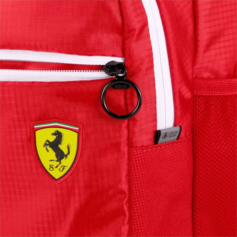 フェラーリのエンブレムがあしらわれたポリエステル素材のバックパック。