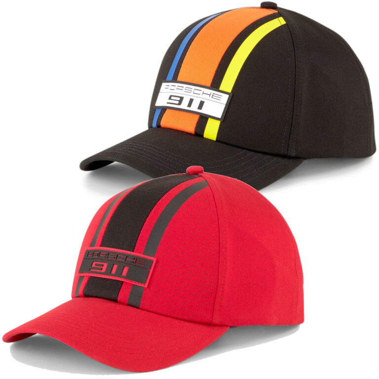 ポルシェ911のロゴと3本のストライプが入った、ポルシェレガシーコレクションのベースボールキャップ。