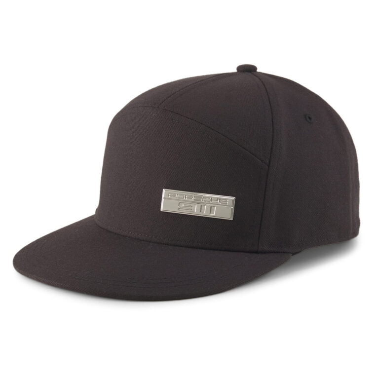 ポルシェ911のメタルプレートロゴがあしらわれた、ポルシェレガシーコレクションのフラットブリムキャップ。