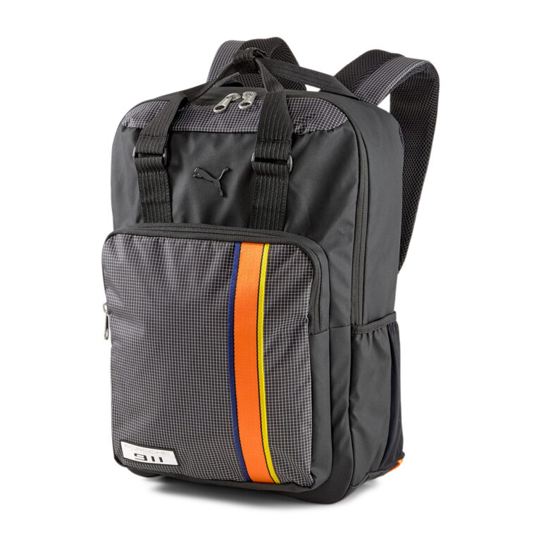 ポルシェ911のロゴとストライプがあしらわれた、ポルシェレガシーコレクションの2WAYタイプのバックパック。