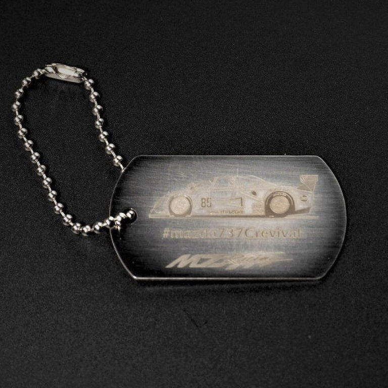 マツダグループC2プログラムの集大成であるマツダ737Cの精密イラストをレーザーで刻印したドッグタグ。