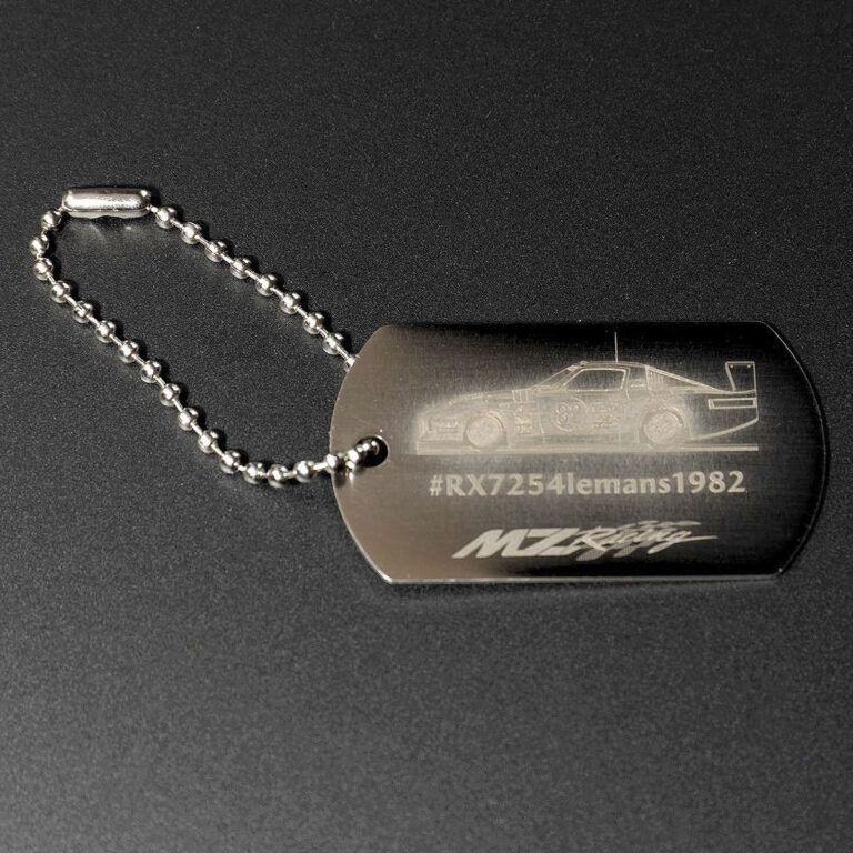 1982年のルマンで初完走を果たしたRX-7 254の精密イラストをレーザーで刻印したドッグタグ。