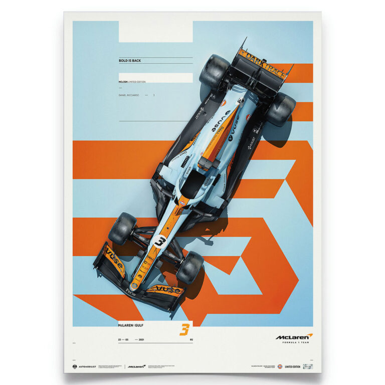 2020年7月にマクラーレンF1チームとパートナーシップを結んだガルフ・オイル・インターナショナルが2021年のF1モナコGPでガルフカラーを限定復活。往年のカラーを現代に蘇らせたトリビュートデザインはまさに1990年代のガルフ・マクラーレンを思い起こさせるコラボレーション。世界限定1000枚のリミテッドエディションポスターとなります。