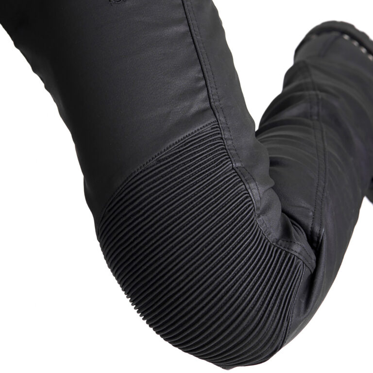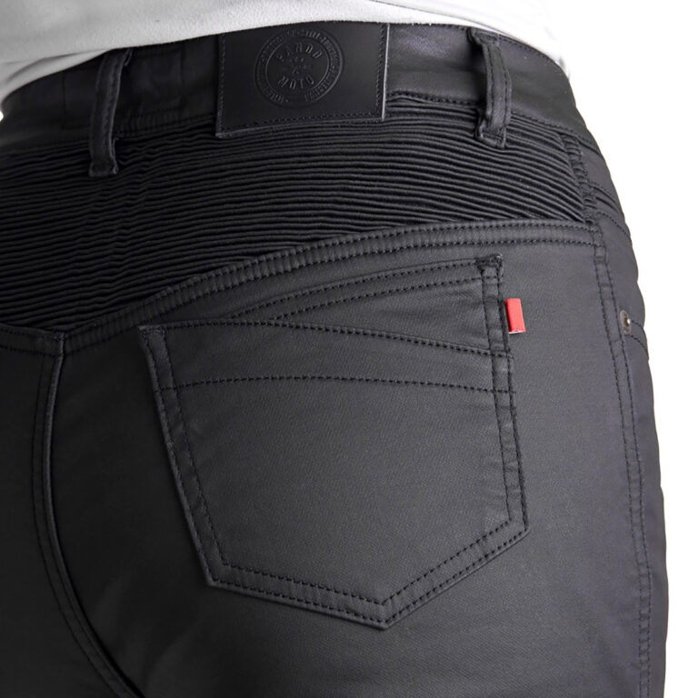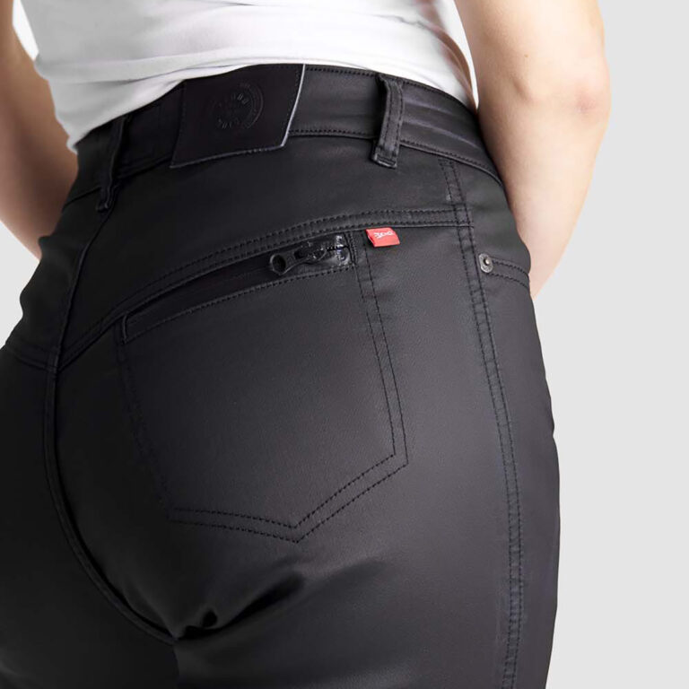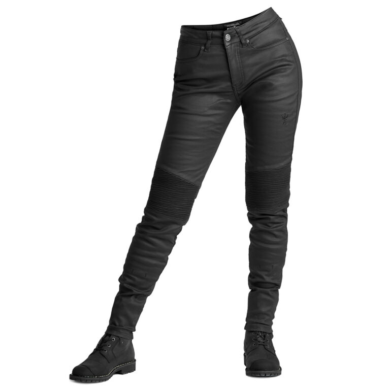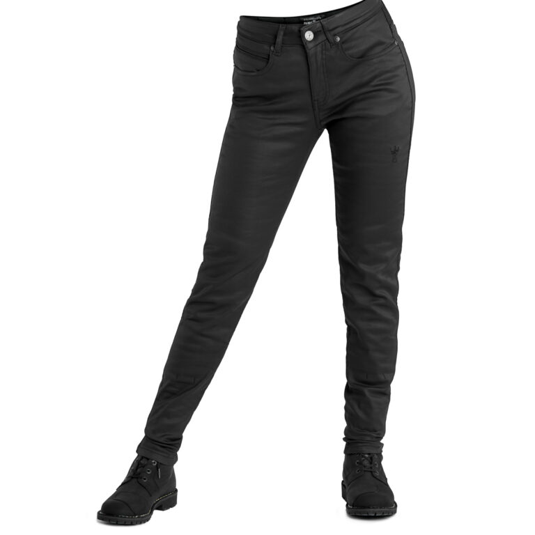 スキニーシルエットと9オンスワックスストレッチデニムを使用したレディース用ライディングパンツ。
