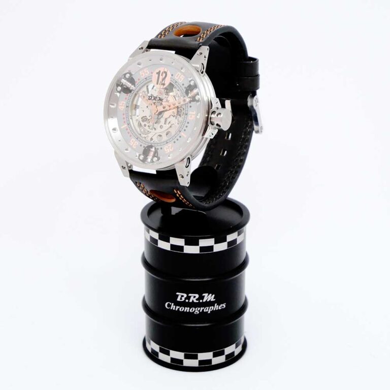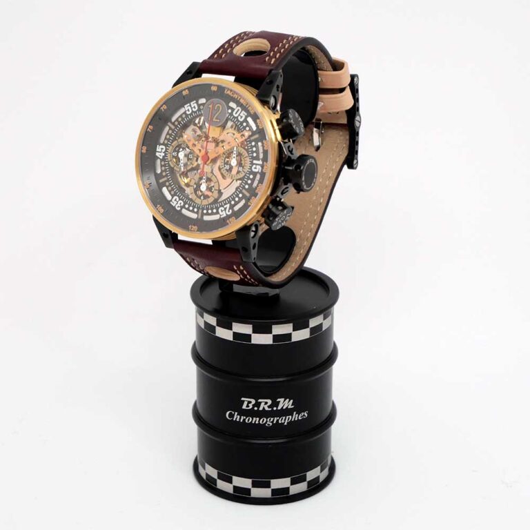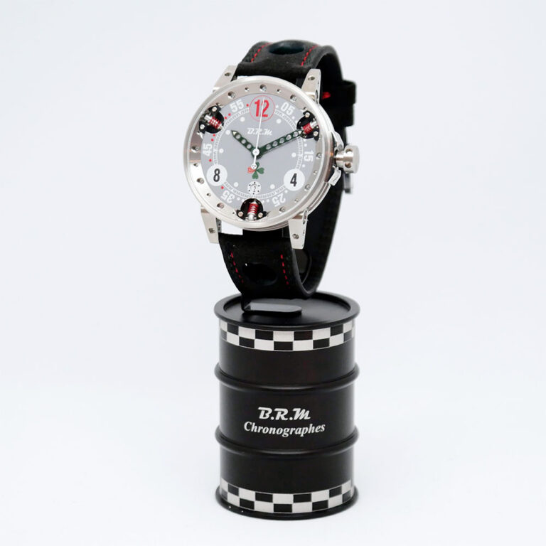 そして今回、そのB.R.MとLa Festa Primaveraがコラボレーションした限定クロノグラフが発売されることになりました。サスペンションなどのギミックが搭載されたV6モデルをベースに、ピストンを模したリューズや、穴あきペダルをイメージした長針・短針といったディテールはそのままに、ミッレミリアの本国イタリアの国旗にちなんだグリーン、ホワイト、レッドのトリコロールカラーが随所に散りばめられた、まさにクルマ好きの心をくすぐるデザインに仕上げられています。
