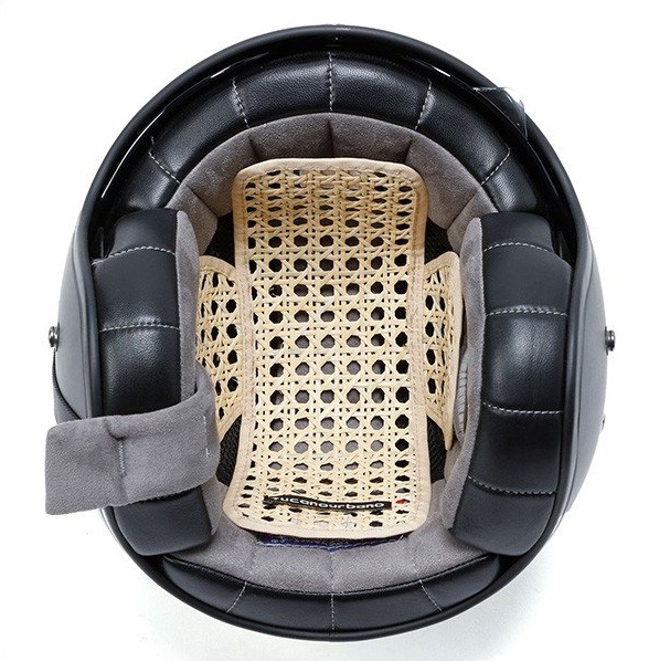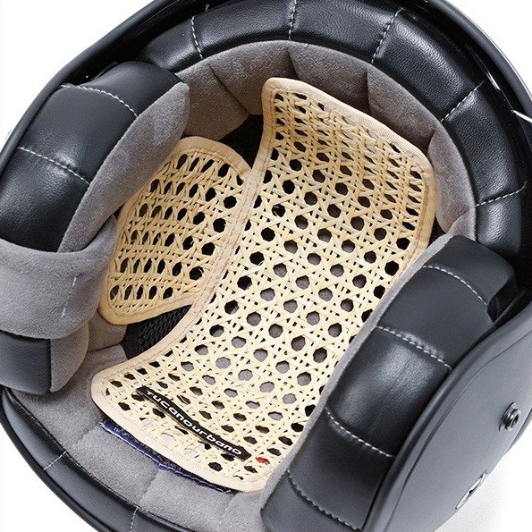 ラタンの特徴は、軽くて、しなやかで、しかも丈夫な点。常に呼吸をし続けているので、湿気の多いときには吸収して湿度を下げたり、逆に乾燥していれば、勝手に水分を放出して湿度を上げたりする効果があります。まさにヘルメットのような密閉空間にラタンは欠かせません。