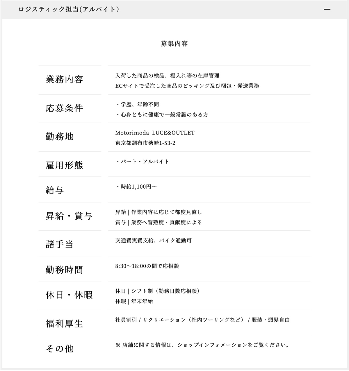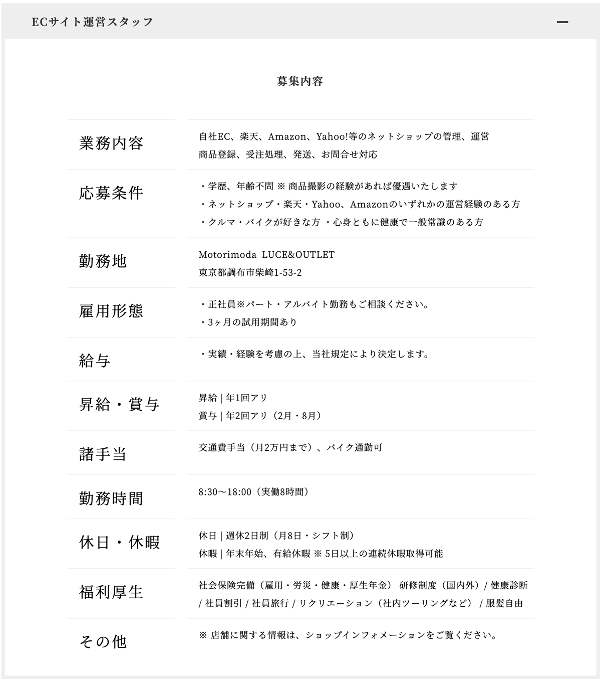 Motorimodaでは業務拡張につき、EC運営スタッフ(正社員)及びロジスティック担当スタッフ(アルバイト)を募集しております。応募者のスキルに合わせて幅広いポジションを用意いております。