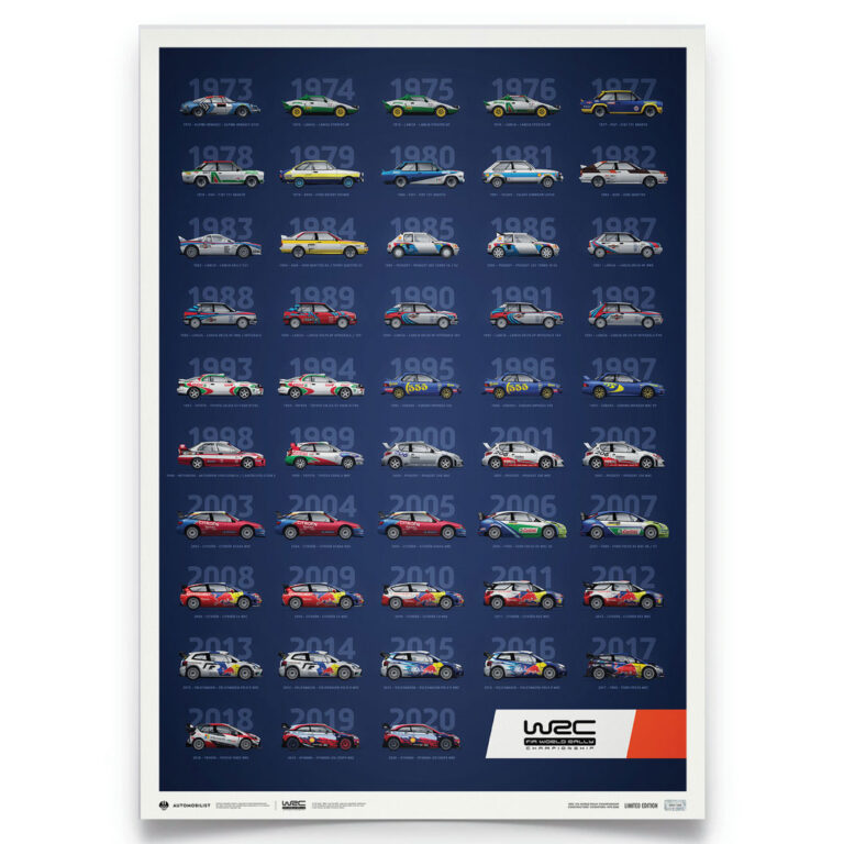 WRC(FIA世界ラリー選手権)として正式にスタートした1973年から2020年までの歴代チャンピオンマシン48台がプリントされた、ユニーク&リミテッドのオフィシャルポスターのご予約を受付中です。