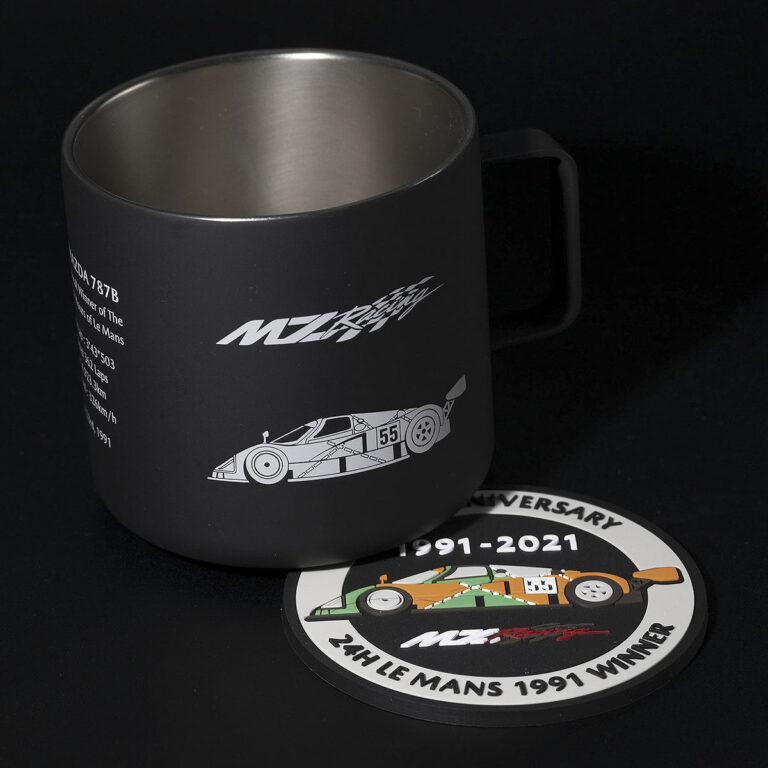 ルマン優勝から30周年を祝したデザインで、マツダ787Bの精密画をフルカラーで再現しました。図柄を立体的に浮き上がらせることで通常のプリントとは一線を画したクオリティを実現し、結露による水滴も立体造形により効果的に除去されるので不用意にコップが滑ることもありません。