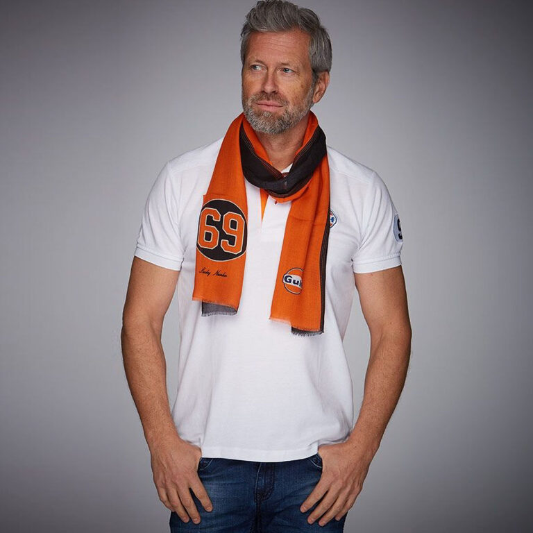 オレンジを基調としたガルフオリジナルのモダールストール。こちらもポロシャツと同様にフォードGT40のラッキーナンバー「69」があしらわれています。
