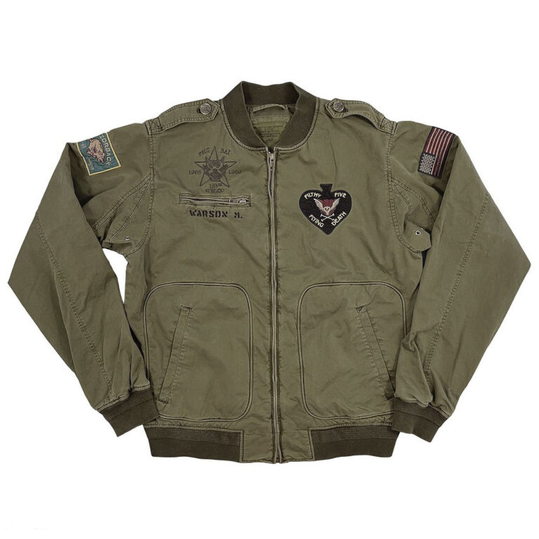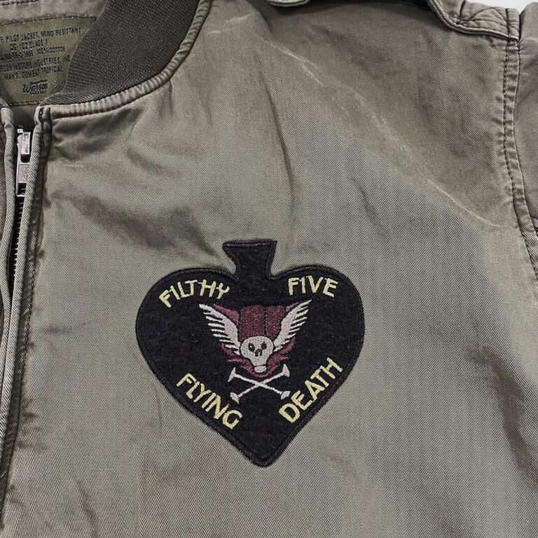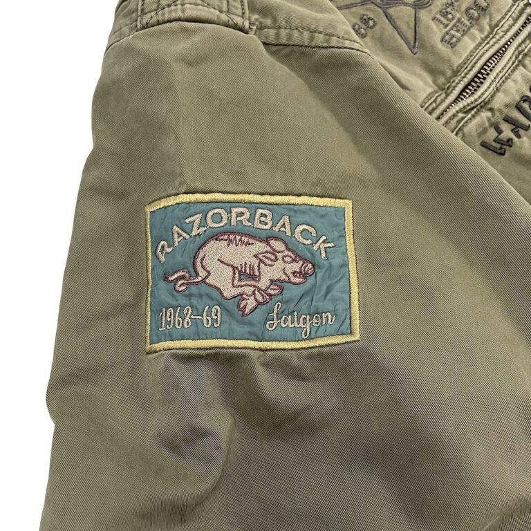 ベトナム戦争で活躍した、米国の第120攻撃ヘリコプター中隊「レイザーバックス」と、米海軍ヘリコプター攻撃戦隊 HAL-3 DET-5 FILTHY FIVEの刺繍ワッペンがあしらわれており、当時のパイロットが着用していたジャケットと同じような仕様で再現されています。
