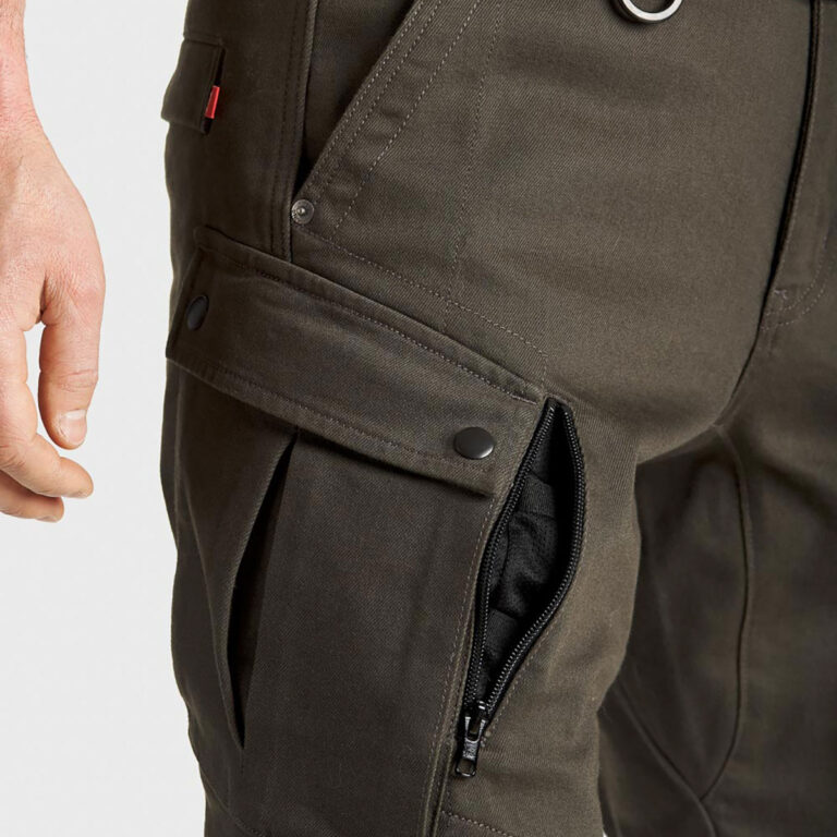 カーゴポケットの内側にジップ開閉式ののベンチレーションを付属。バタつき防止のため、全てのポケットにスナップボタンを採用。裾部分はブーツやシューズにフィットするように、スナップボタンで調節可能。米国デュポン社製の高強度素材(ケブラー®)を裏地とステッチに使用し、耐久性・安全性を高めています。
