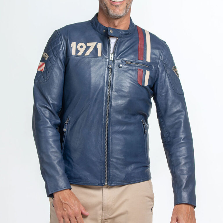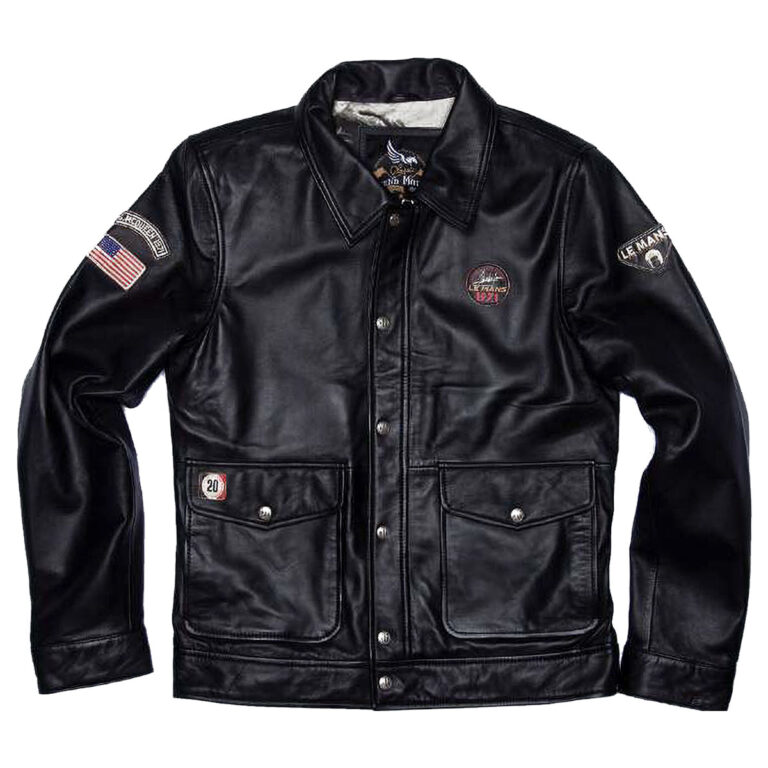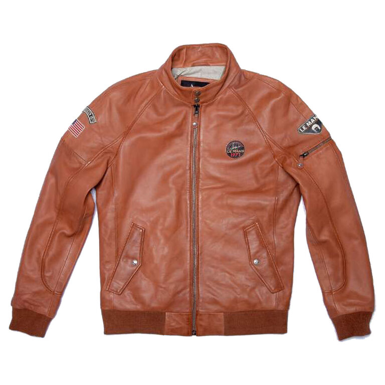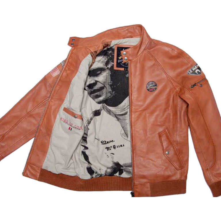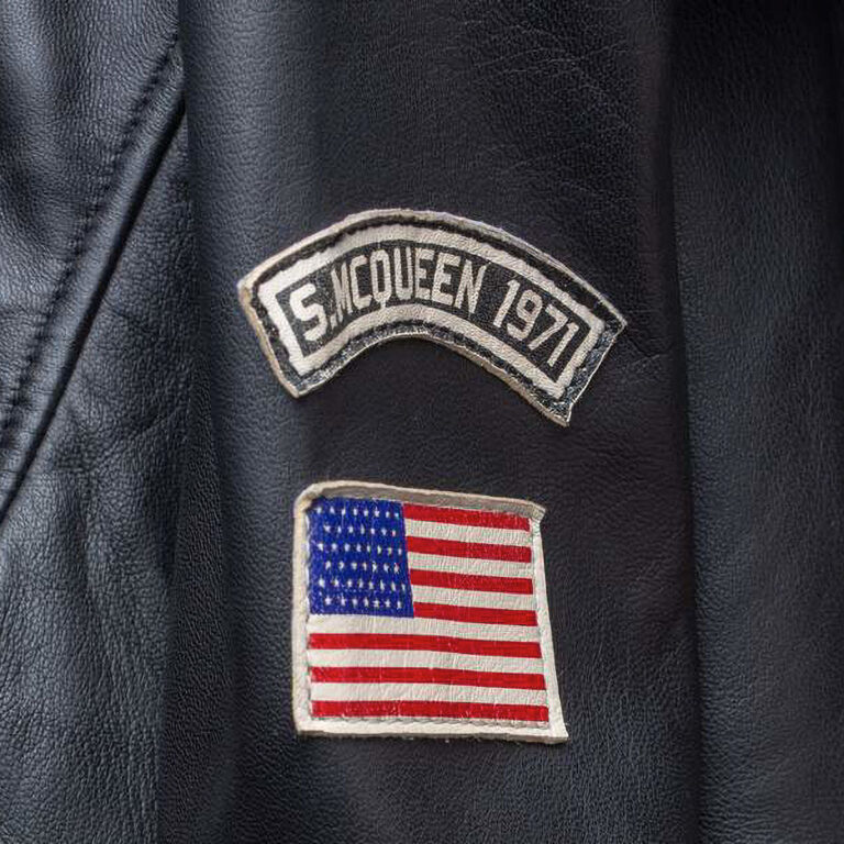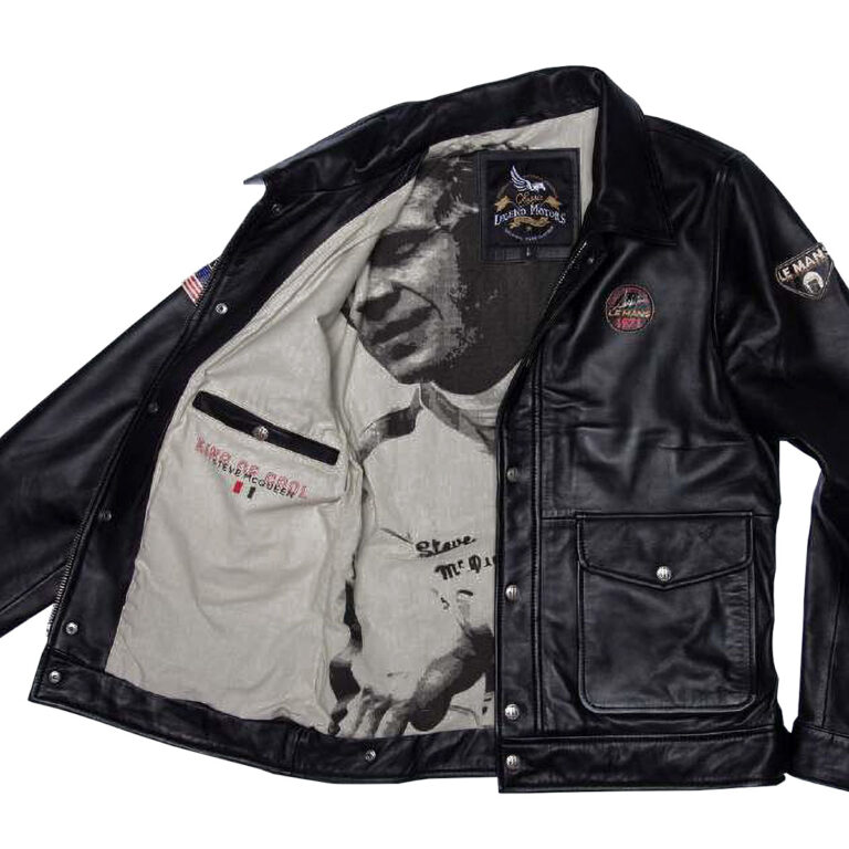 ル・マン24時間レースやマックィーンにちなんだアメリカ国旗の刺繍ワッペンがあしらわれたシンプルなデザイン襟付きのシングルライダースジャケット。裾と袖口がリブ仕様になっており、インナーにマックィーンのモノクロ写真がプリントされています。