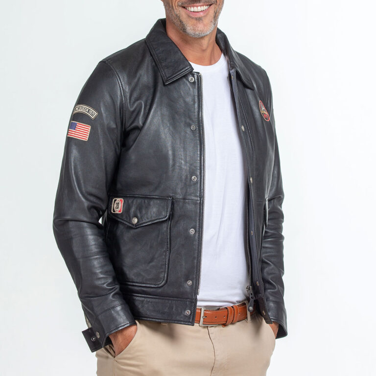 襟にボタンフラップがついた、シングルライダースジャケット。ル・マン24時間レースやマックィーンにちなんだアメリカ国旗の刺繍ワッペンがあしらわれたシンプルなデザインが特徴的で、インナーにマックィーンのモノクロ写真がプリントされています。
