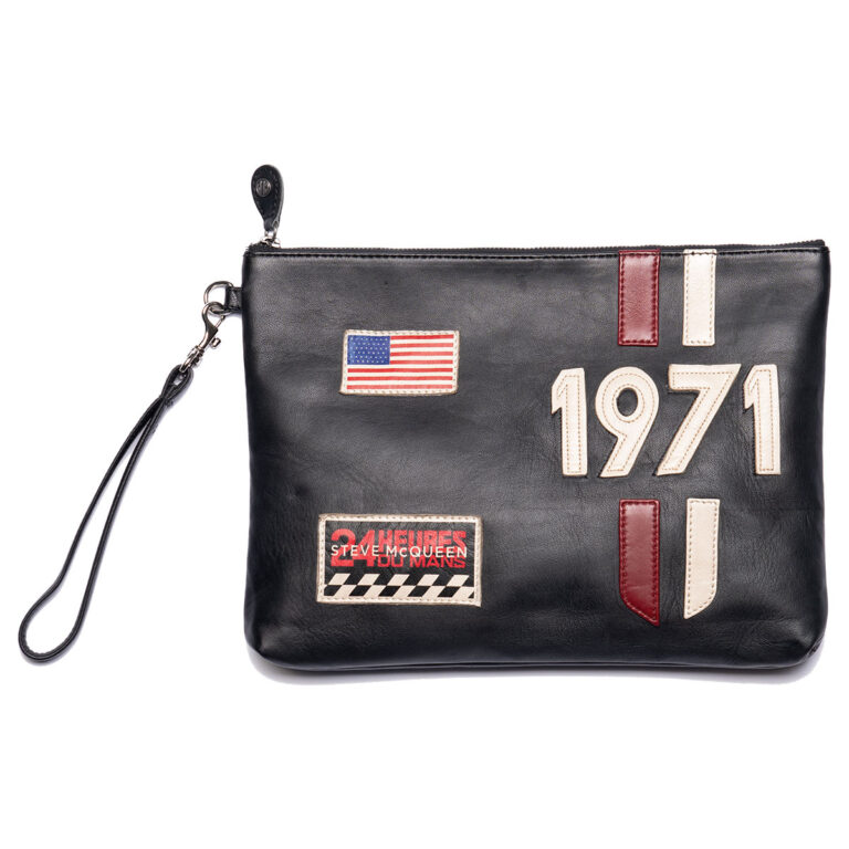 映画「栄光のルマン」でM・ディレイニ―が着用していたレーシングスーツのデザインを連想させるレーシングストライプや、アメリカ国旗の刺繍ワッペンがあしらわれたレザーポシェット。ちょっとした小物を入れるのに最適なサイズ感で、持ち運びに便利なストラップがついています。