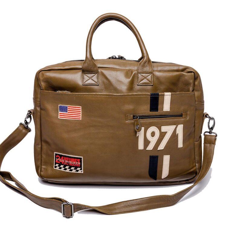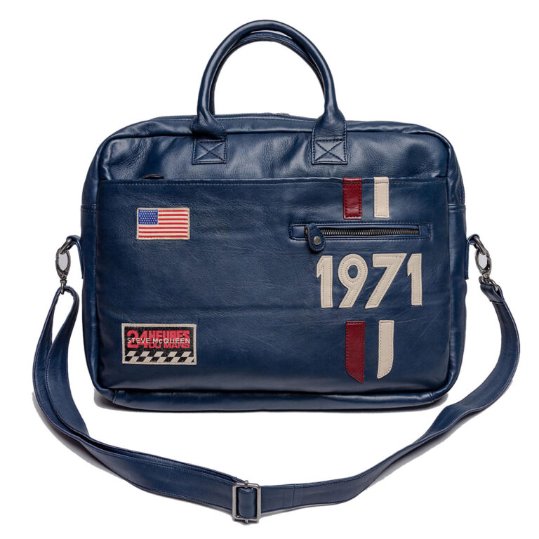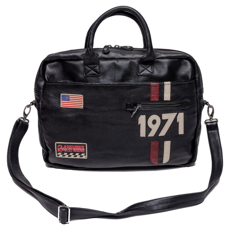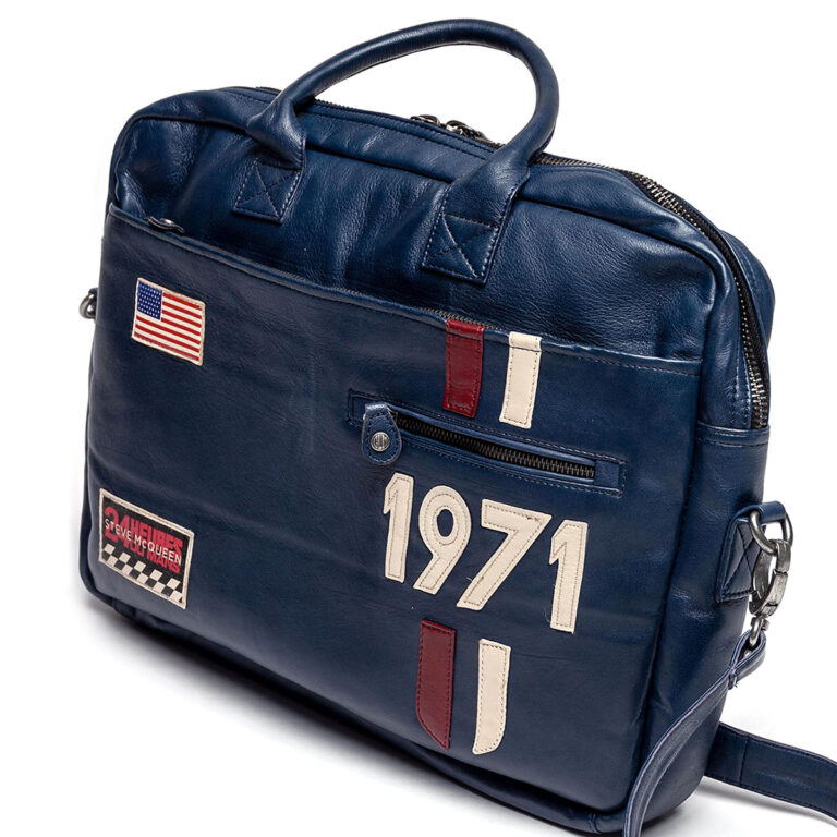 映画「栄光のルマン」でM・ディレイニ―が着用していたレーシングスーツのデザインを連想させるレーシングストライプや、アメリカ国旗の刺繍ワッペンがあしらわれたレザーメッセンジャーバッグ。ノート型パソコンやタブレットなど収納可能。付属のストラップで肩掛けもできる、2WAYタイプです。