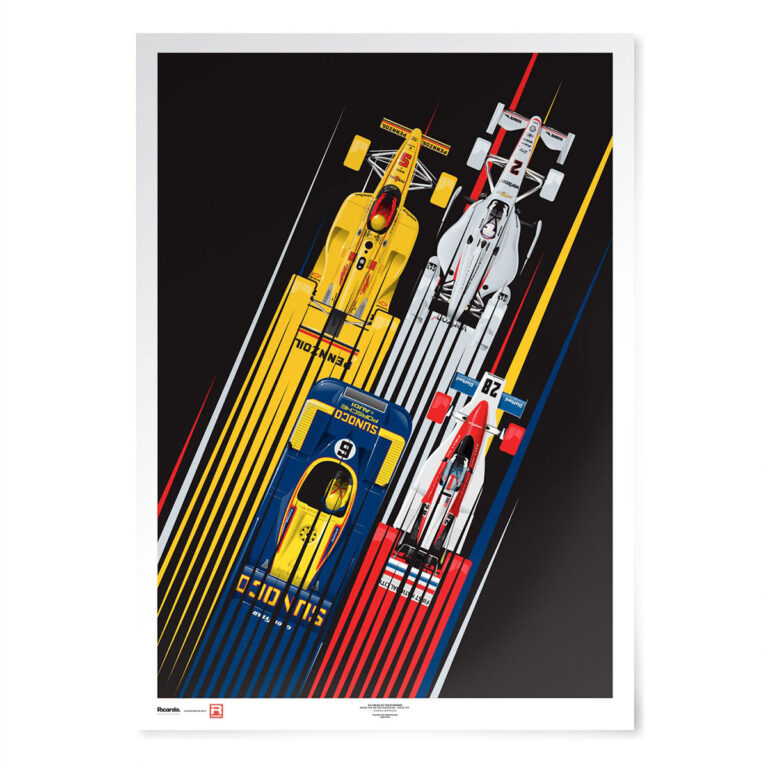 アメリカを中心としたインディやストックカー、スポーツカーレースなどに参戦を続けているペンスキー・レーシングは、1970年代にSUNOCOカラーのフェラーリやポルシェといったレーシングカーでその名を轟かせ、F1やインディ、CARTなど、様々なカテゴリーで活躍。ポスターには、ポルシェ917/30をはじめ、F1に参戦したPC4、1988年にリック・メアーズのドライブによりインディ500を制したPC-17、2017年にジョセフ・ニューガーデンによってインディーカーシリーズのチャンピオンに輝いたインディーカーが描かれています。