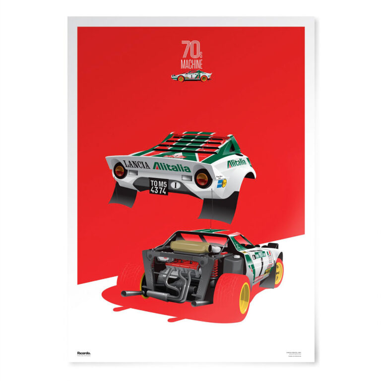 リアカウルが取り外され、ディーノのV6エンジンがむき出しになったランチアストラトスが描かれたポスター。