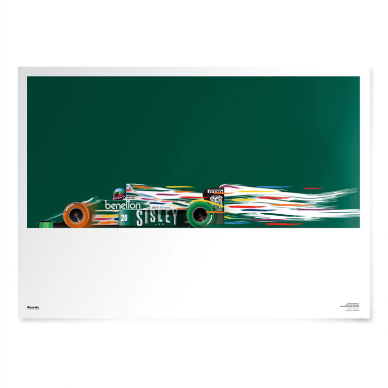 1986年のF1開幕戦ブラジルGPに出走した、ゲルハルト・ベルガーがドライブするベネトン・B186が描かれたポスター。